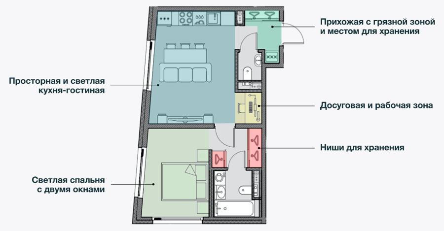 Высокий уровень комфорта внутри квартала Вы будете ощущать благодаря благоустроенным зеленым зонам и пешеходным зонам для прогулок. А еще для Вас на территории предусмотрены коммерческие помещения для ритейла, паркинг, а также эстетично оформленные входные группы. Для Ваших детей напротив комплекса расположены детский сад и школа.